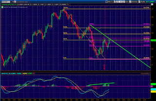 A chart of the hourly crude oil shown to the left, you can see a zoom up of todays action (if you can call it that). The purple and green lines can be seen in my post from yesterday and what they are. Basically we stayed below the purple line which had provided support for the last few weeks of range trading and above the green line which is the 50% projection of the potential down move. We really saw nothing today, a few attempts to go both ways but nothing interesting and we dont think it can stay in this tiny of a range too much longer, expect a breakout one way or the other.